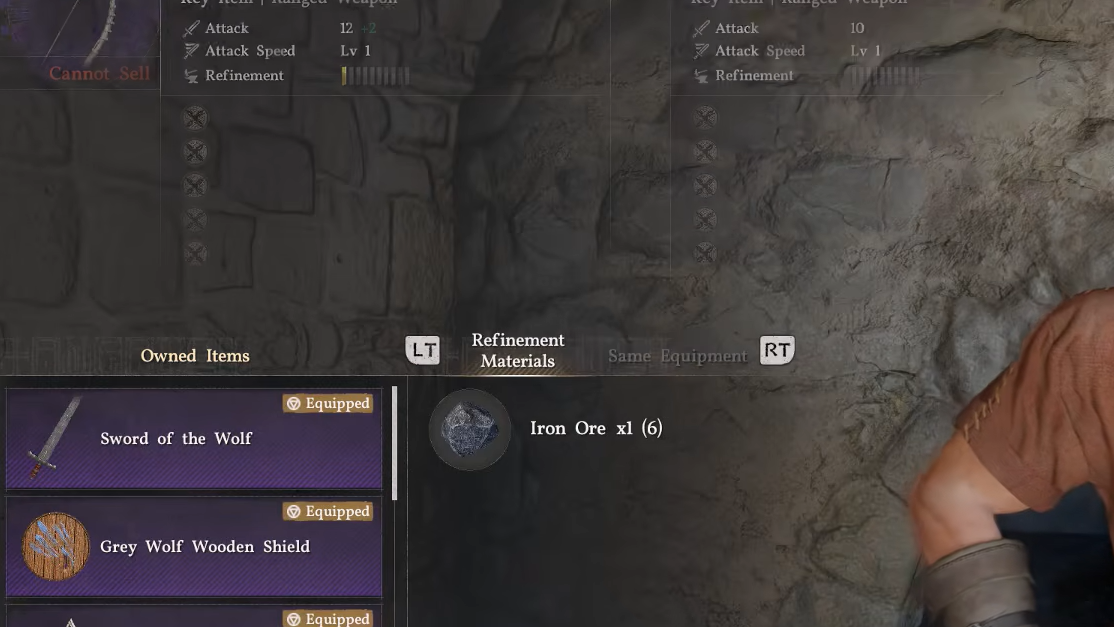 Separate from permanent refinement, you'll find Grindstones and Anvils scattered at camps and outside blacksmith shops throughout Pywel. Using a Grindstone temporarily raises your weapon's attack power, while using an Anvil temporarily raises your armor's defense. These buffs fade over time — check the stat on the item in your inventory to see if it's still active. Hitting one of these tools before a boss fight is a small edge worth taking.