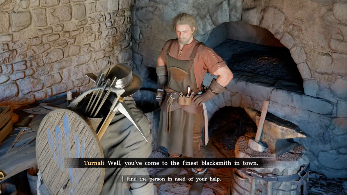 Step 1: Find Turnali near his anvil in Hernand. If you entered from the northwest, follow the road east, pass the wooden staircase on your left, continue past the troll named Rhett, and go through the open arch.