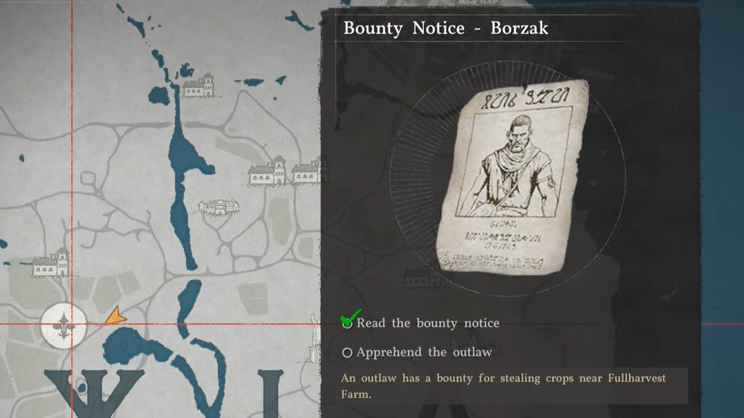 Walk up to the notice and hold CTRL on the keyboard (or LB / L1 on a gamepad) to read it. The notice lists Borzak's name, a description of his appearance, his last known location at Fullharvest Farm, and the 15-silver reward for a live capture.