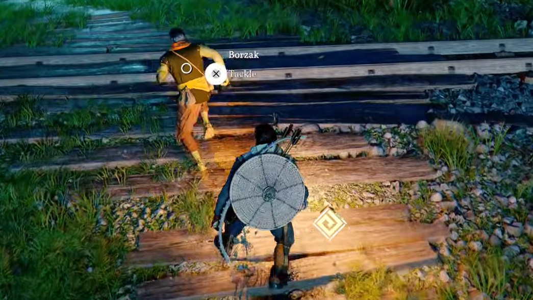 Step 1: Sprint toward Borzak once you spot him. He'll try to run the moment you get close. Press the on-screen button prompt to tackle him to the ground.