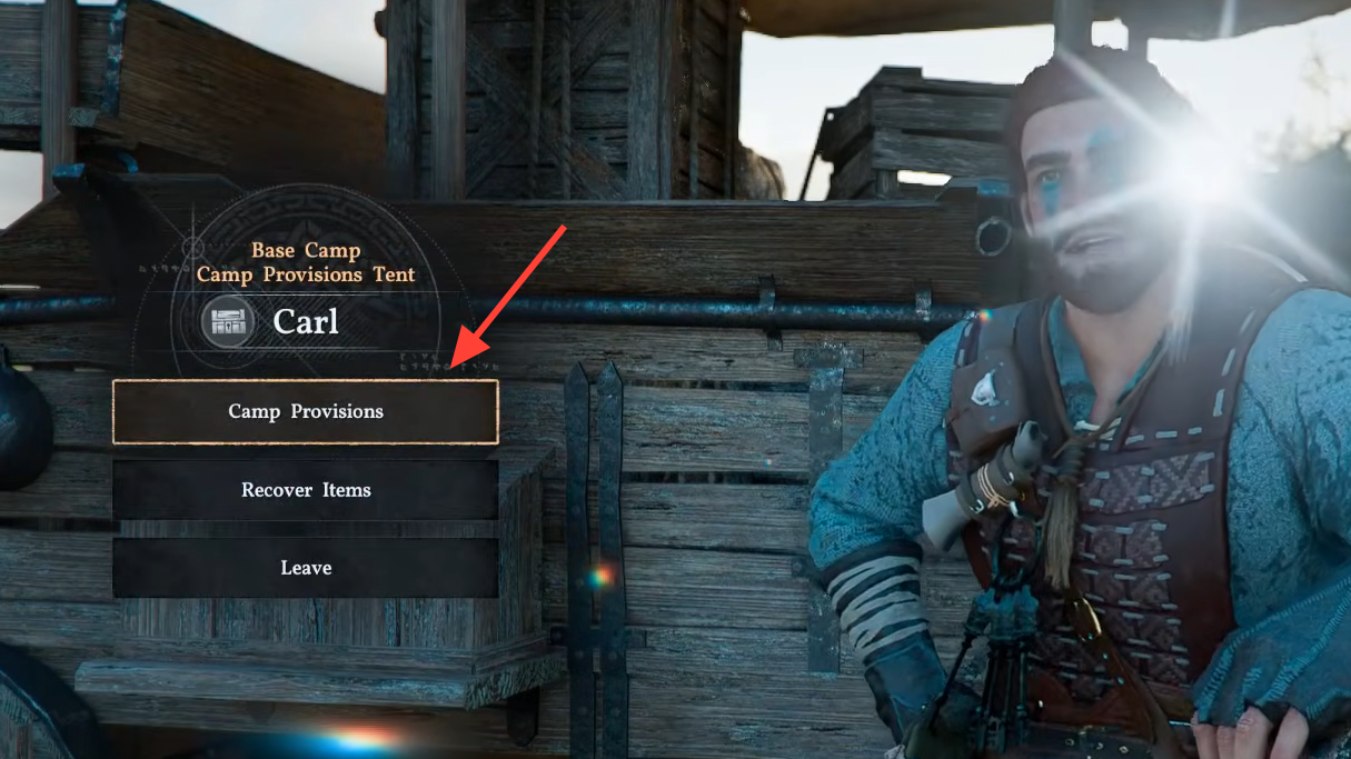Step 2: Interact with Carl and select the "Camp Provisions" option from his menu.