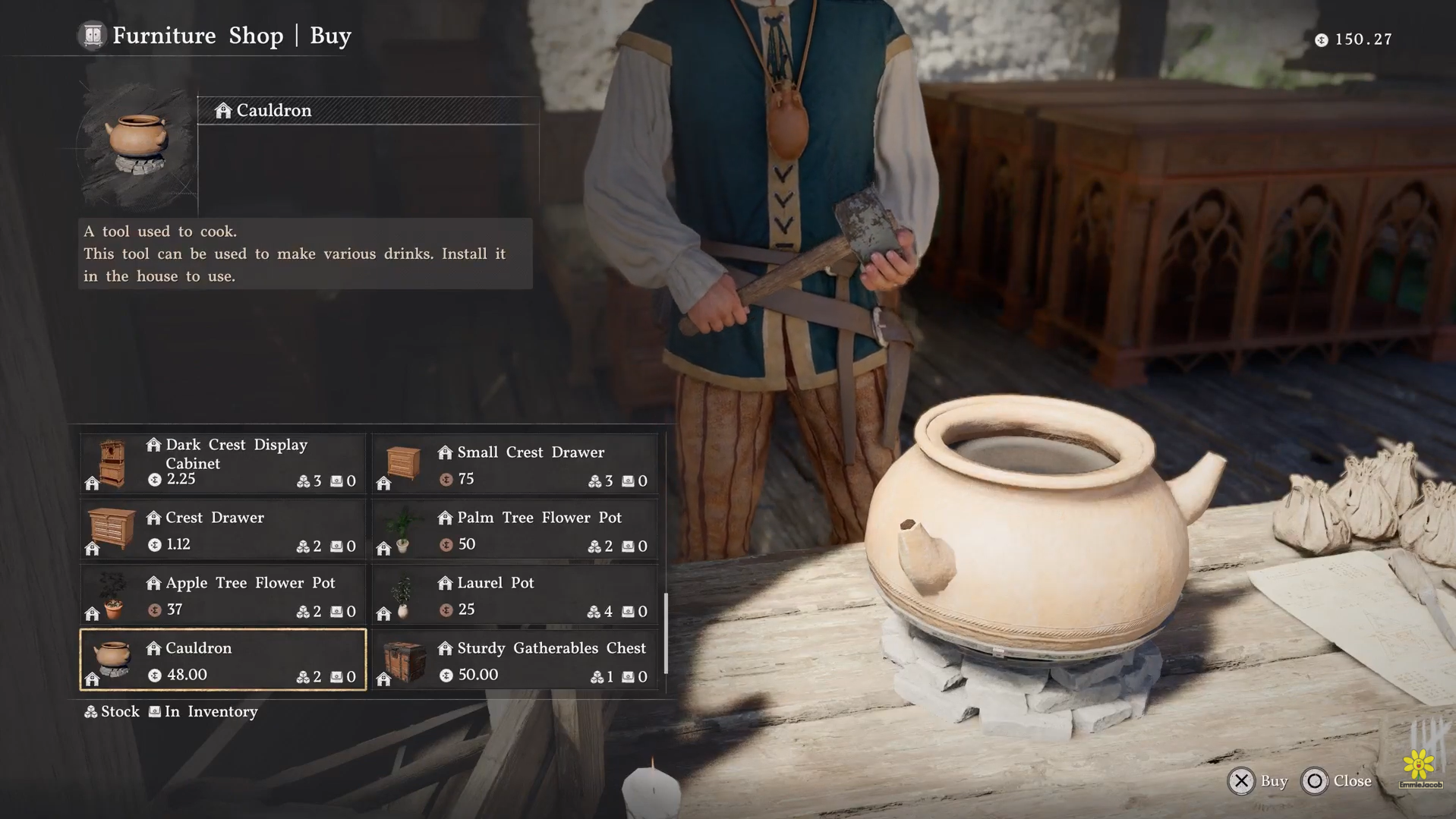 Colin operates the Furniture Shop at Hidden Grove Ranch, north of Demeniss. His Cooking Pot costs 32 silver and is meant for "various soupy dishes," covering broths, porridges, and stews that the griddle and cauldron can't make.