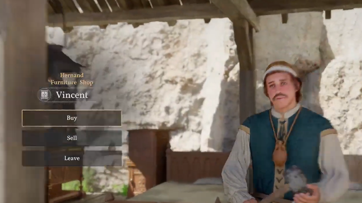 Vincent runs the Furniture Shop at Timberham Sawmill, a small lumber outpost southwest of Hernand town. He's described in-game as a Hernand carpenter whose work could "turn any house into an elegant manor," and his shelves include the Cauldron alongside chairs, tables, and storage furniture.