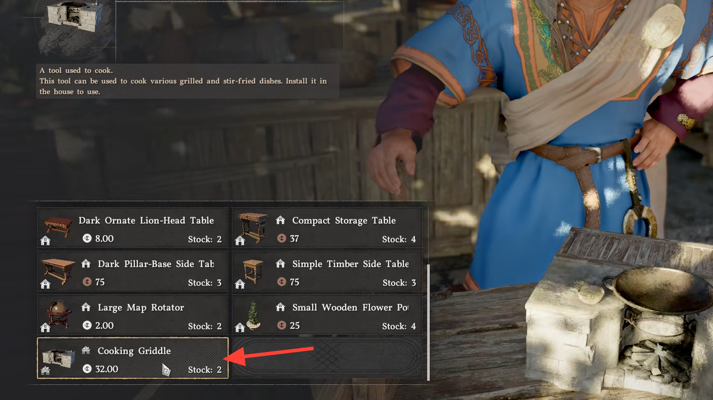 Erik's shop sits in Beighen, a village in the Pailun region. The fastest approach is to fast travel to a nearby waypoint and follow the river east into the village; his stall is under a wooden structure with a red roof. He sells the Cooking Griddle for 32 silver, described as a tool for "various grilled and stir-fried dishes."