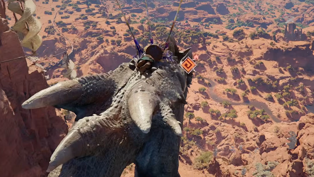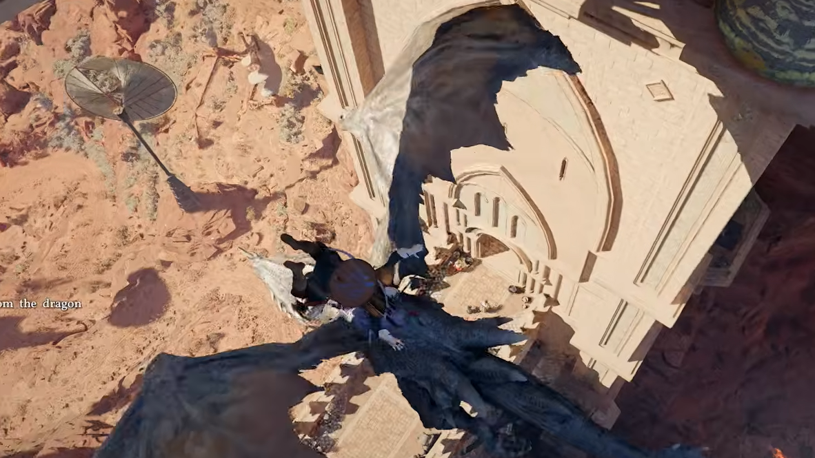 Step 2: As the dragon passes close to the bridge, jump off and immediately activate your wings by pressing Square (PlayStation), X (Xbox), or Spacebar (PC) to glide.