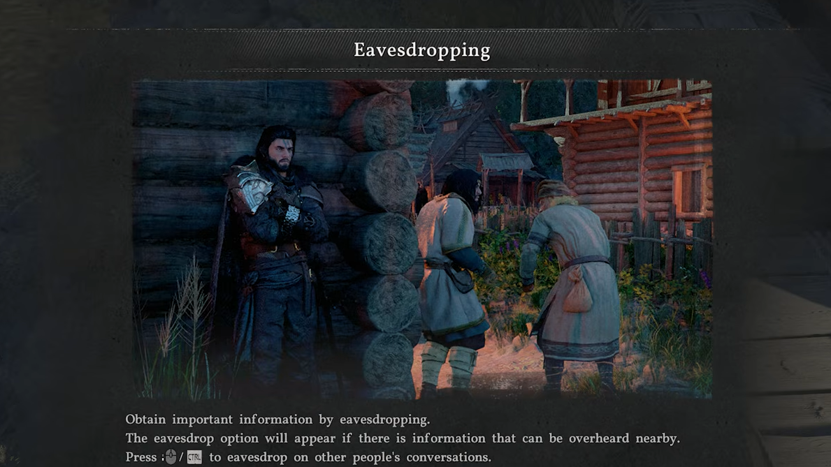 Eavesdropping is context-sensitive. The prompt only appears when your character is aligned with a valid interaction point — typically a wall, a thin wooden surface, a crack, or a window that separates you from the NPCs who are talking. Simply being nearby is not enough. Your character's facing direction and distance from the surface both matter.