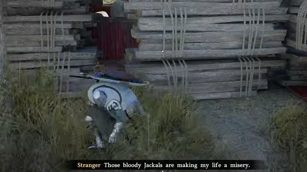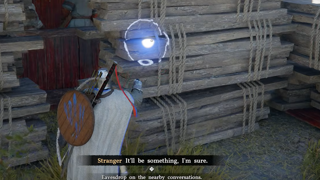 Step 1: Head to the red sawmill near the village waterfront. Behind it, you'll find two piles of logs and a tree. Position yourself near the tree and wait for the "Eavesdrop" prompt.