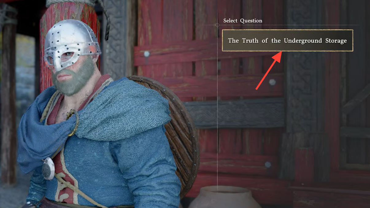 Step 1: Find the Blue Fangs guard leaning against a pillar near the central building in Beighen. Speak to him and select "The Truth of the Underground Storage". He'll claim it's just a larder.