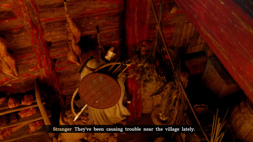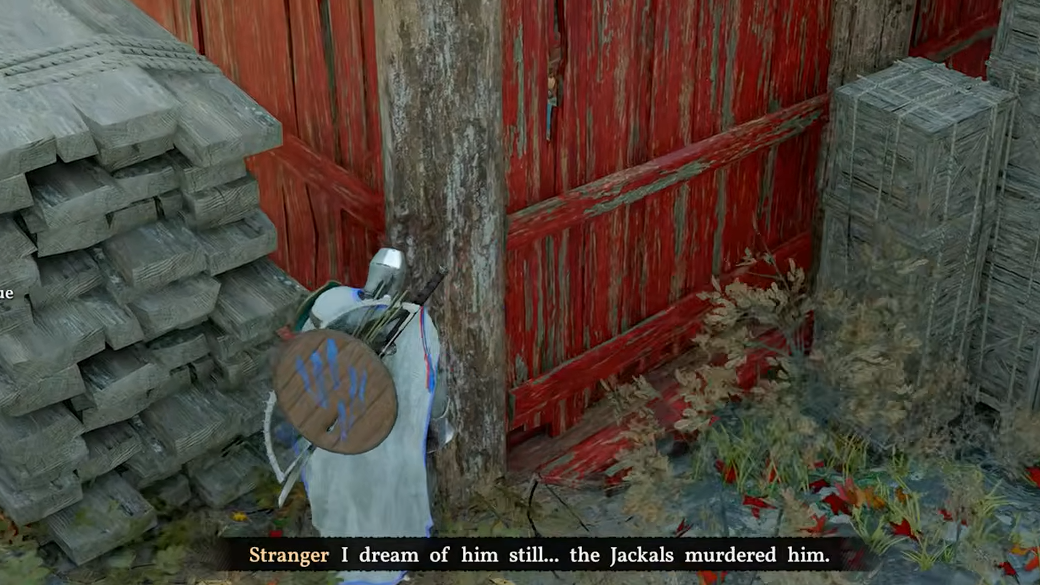 Step 1: Head to the red sawmill near the village waterfront. Behind it, you'll find two piles of logs and a tree. Position yourself near the tree and wait for the "Eavesdrop" prompt.