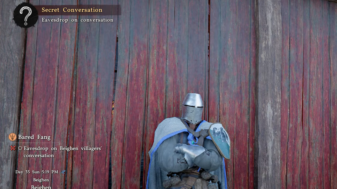 The Bared Fang quest in Beighen is the most eavesdrop-heavy sequence in the game. You cycle between listening in on villagers and then confronting a Blue Fangs guard with the information you've gathered, choosing the correct dialogue options and calling out his lies each time. Below is every step in order.