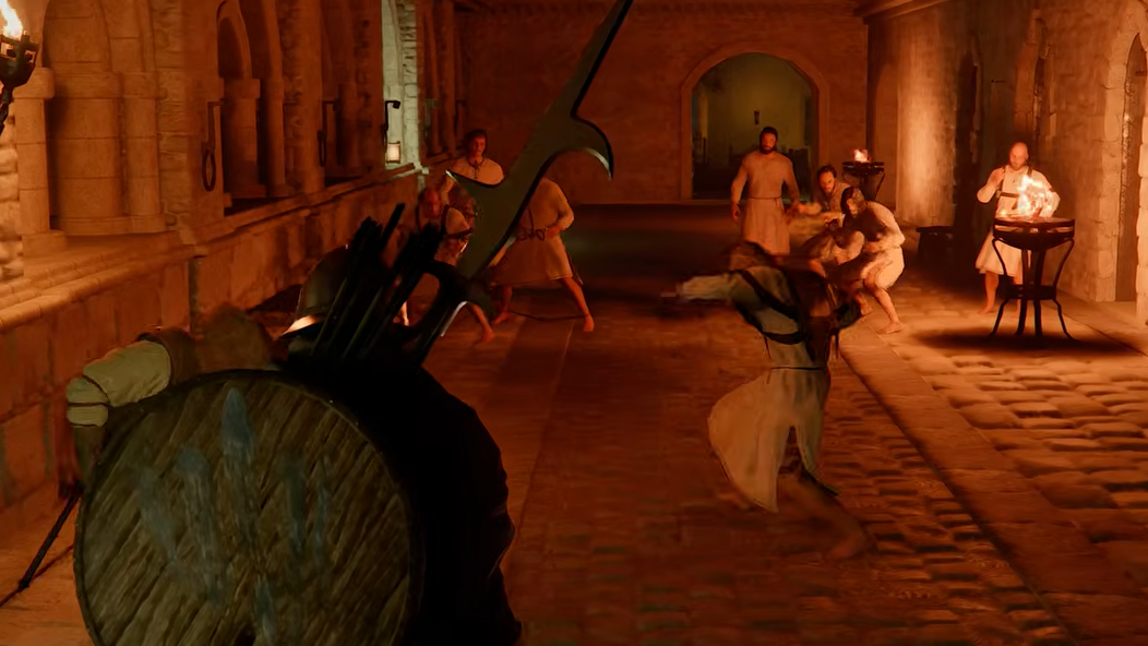 Step 3: Push forward until you spot a large arched door behind a stone wall. Hop over the wall and go through the door. You'll land in a room filled with nobles and cells — and you're already inside the main building.