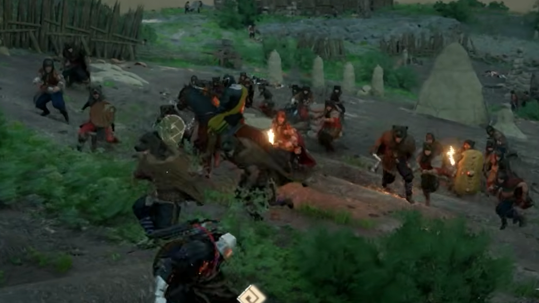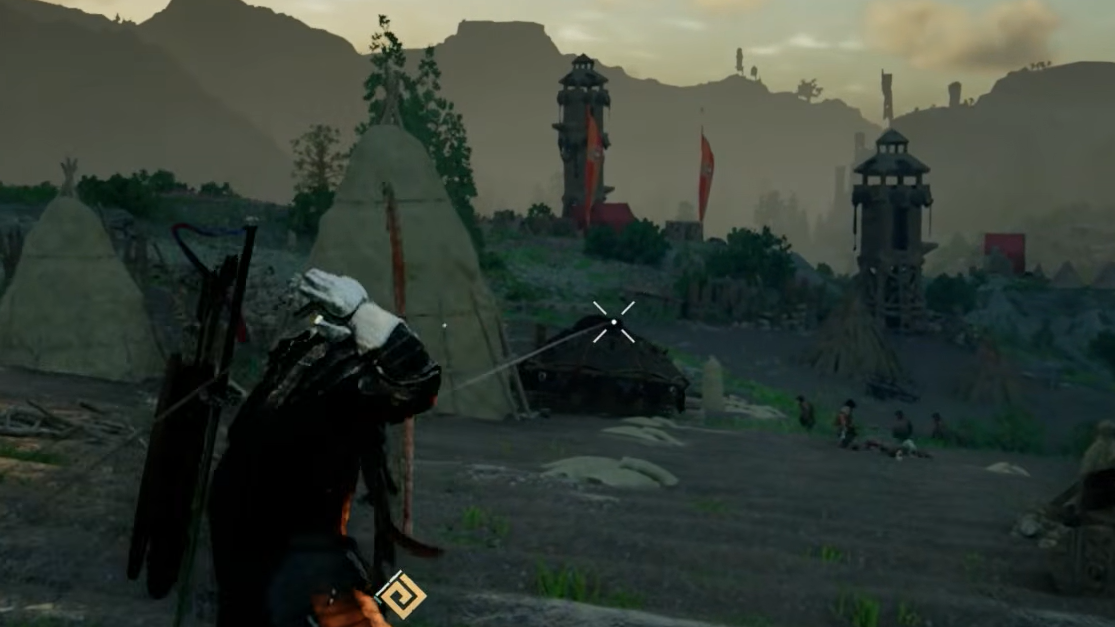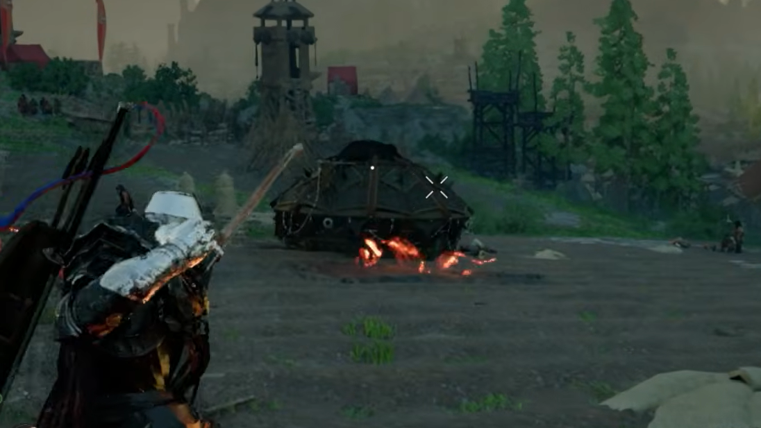 Step 2: Ride toward one of the battle weapons on horseback. You don't need to dismount right next to it — keeping distance is the entire point. When you're within bow range, draw your bow and activate Precision Aim.