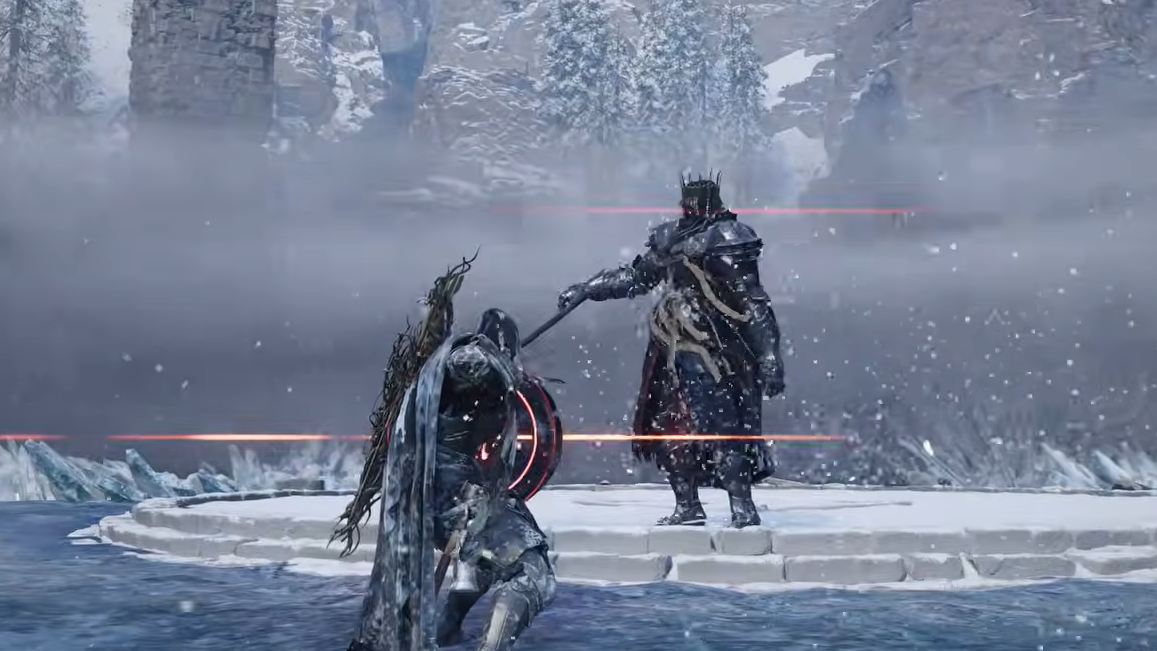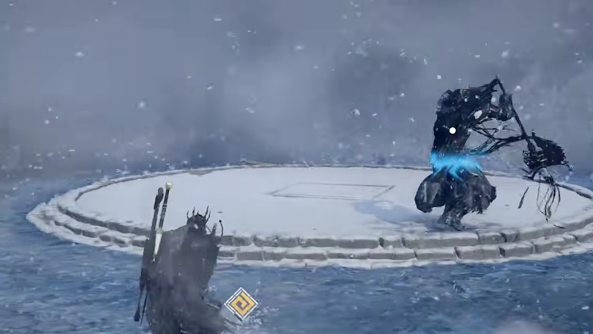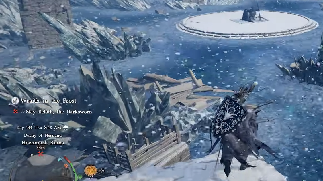 The fight takes place inside the Hoenmark Ruins, an arena ringed by stone pillars in a snow-locked region in Hernand. Approaching the area triggers a constant chill that drops your Temperature bar, slows your movement and combo speed, and drains stamina faster than normal. The lore framing is straightforward: a once-prosperous kingdom was consumed by a deadly frost, and wraiths now attack anyone who comes near.