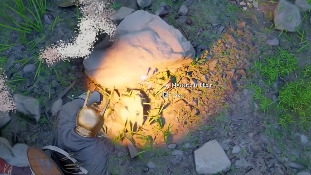 Step 1: After watching the memory, look around the bandit campsite. On a rock near the stolen goods sits an item called the Mysterious Elixir. Walk up to it and interact to pick it up.