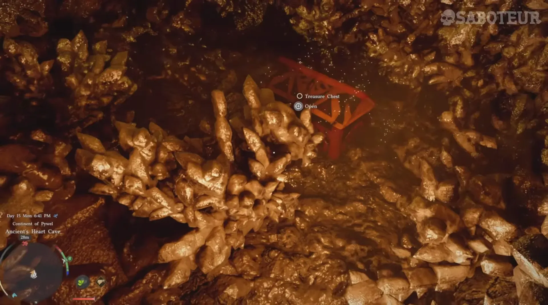 Step 2: Walk through the passageway into a small cave chamber — this is Ancient's Heart Cave. A treasure chest sits in the center of the room.