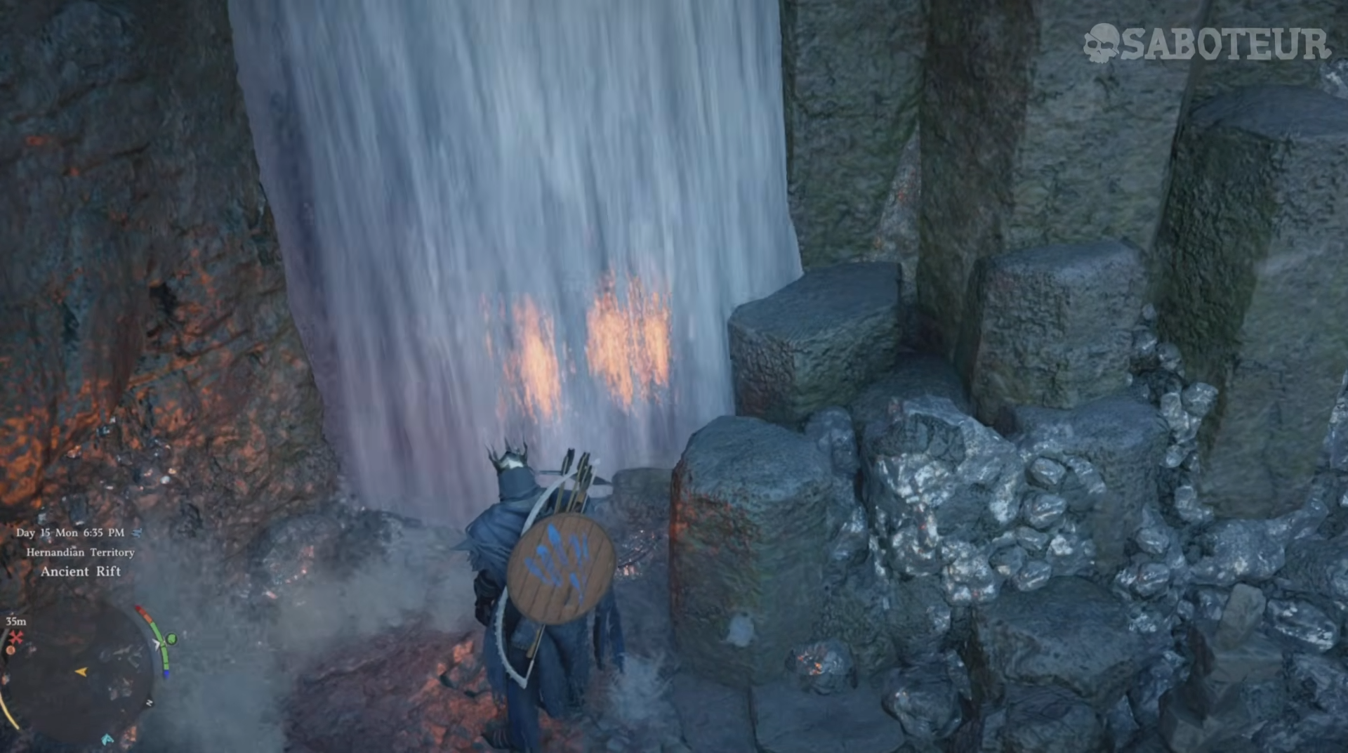Step 2: Look for the large waterfall that divides into two streams. You need to reach the middle elevation on the right side (when facing the waterfall head-on). There's a faint glowing spot visible through the rushing water, hinting at a hidden passage.
