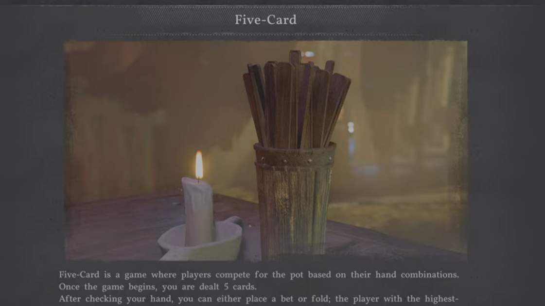 Five-Card costs 150 Silver to enter, and players bet aggressively throughout each round. If you recognize early that your hand is a Bust, folding immediately saves Silver and lets you move to the next round without further losses.