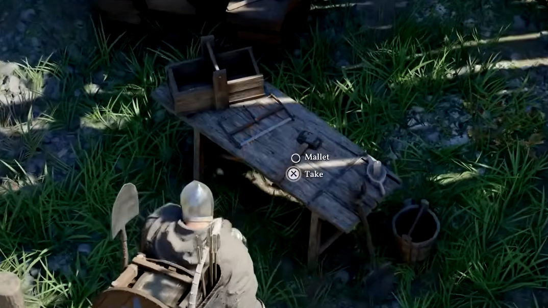 Step 1: Go to the northernmost marker. You'll see a white canopy structure with a small table beside it. On the table sits a mallet — pick it up.