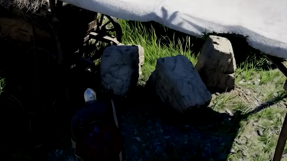 Step 1: Travel to the second northernmost marker. A hay-covered wagon sits outside a tent, but three rocks block its path underneath the tent structure.