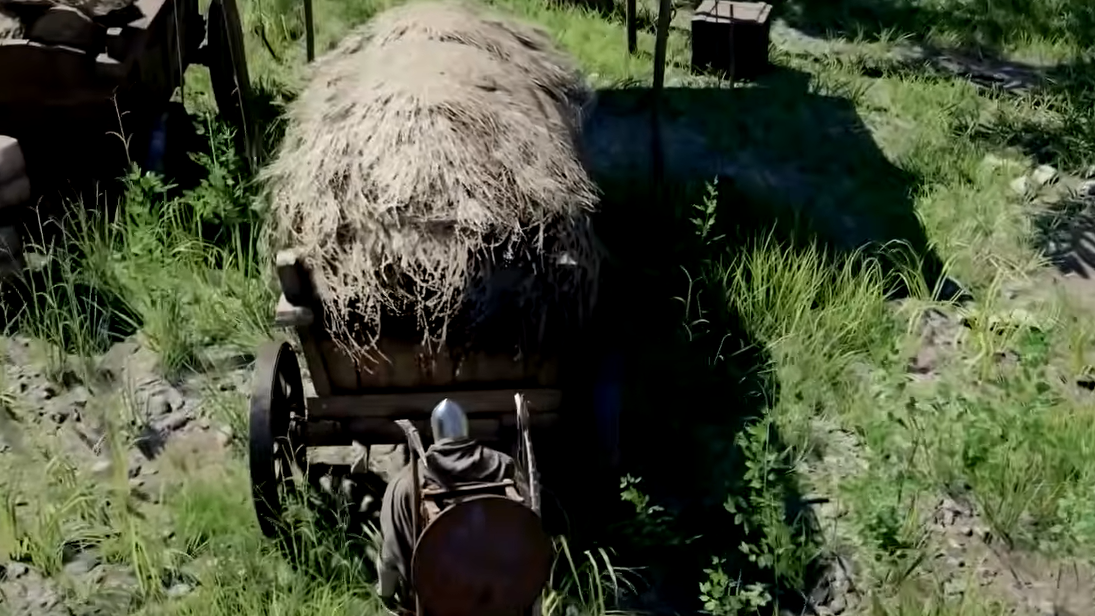 Step 3: With the path cleared, walk behind the wagon and push it forward using your normal movement controls. There's no special interact prompt — just walk into the back of the wagon, and it will slide into position under the tent.