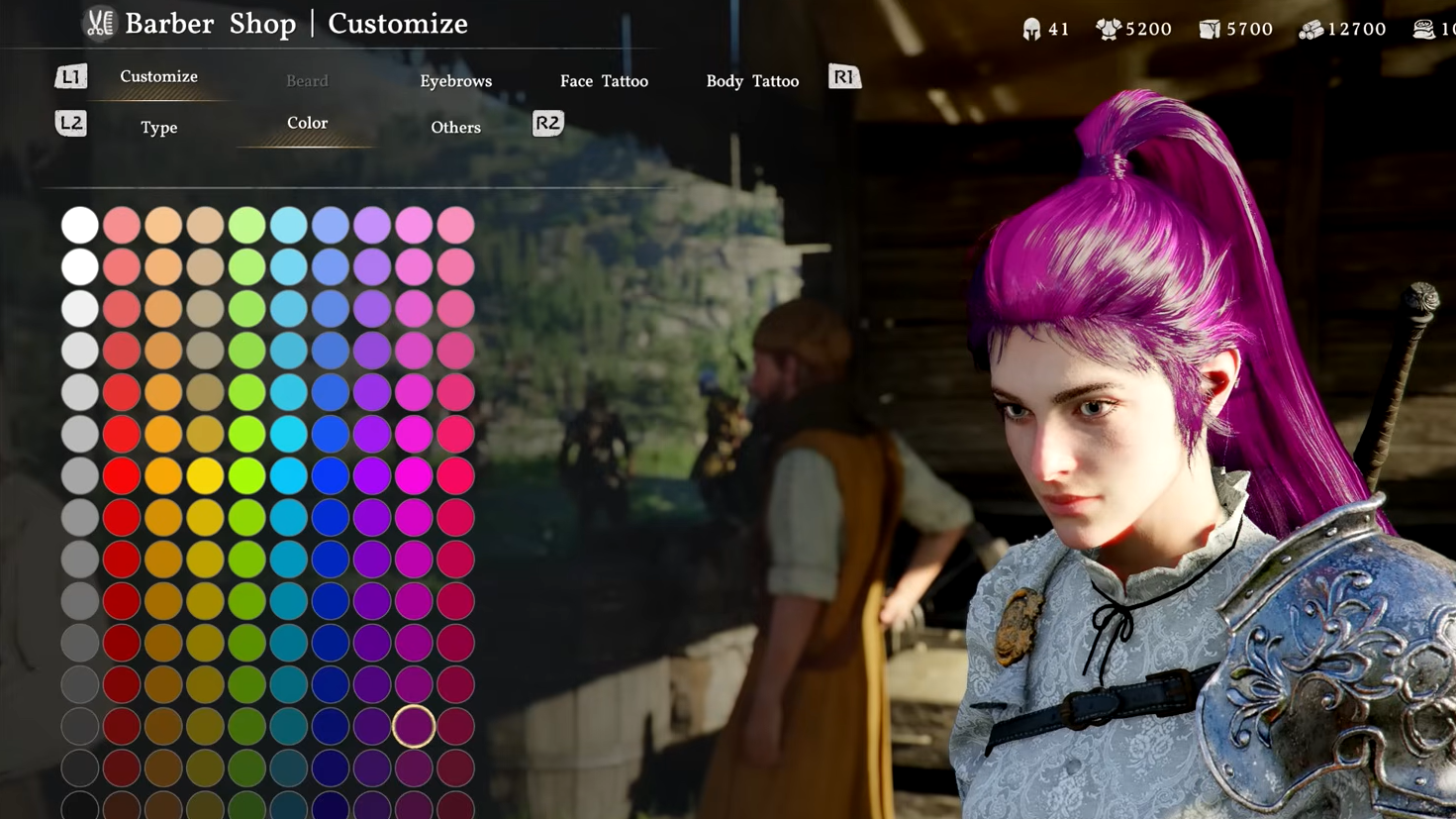 The dye palette mirrors the hair color range — whites, grays, reds, ambers, browns, greens, blues, purples, and pinks — creating a cohesive visual language across your entire loadout. Dyes are not sold through a cash shop. They are found while exploring the open world or brewed through the game's crafting and life-simulation systems, which ties cosmetic progression directly into gameplay rather than a storefront.
