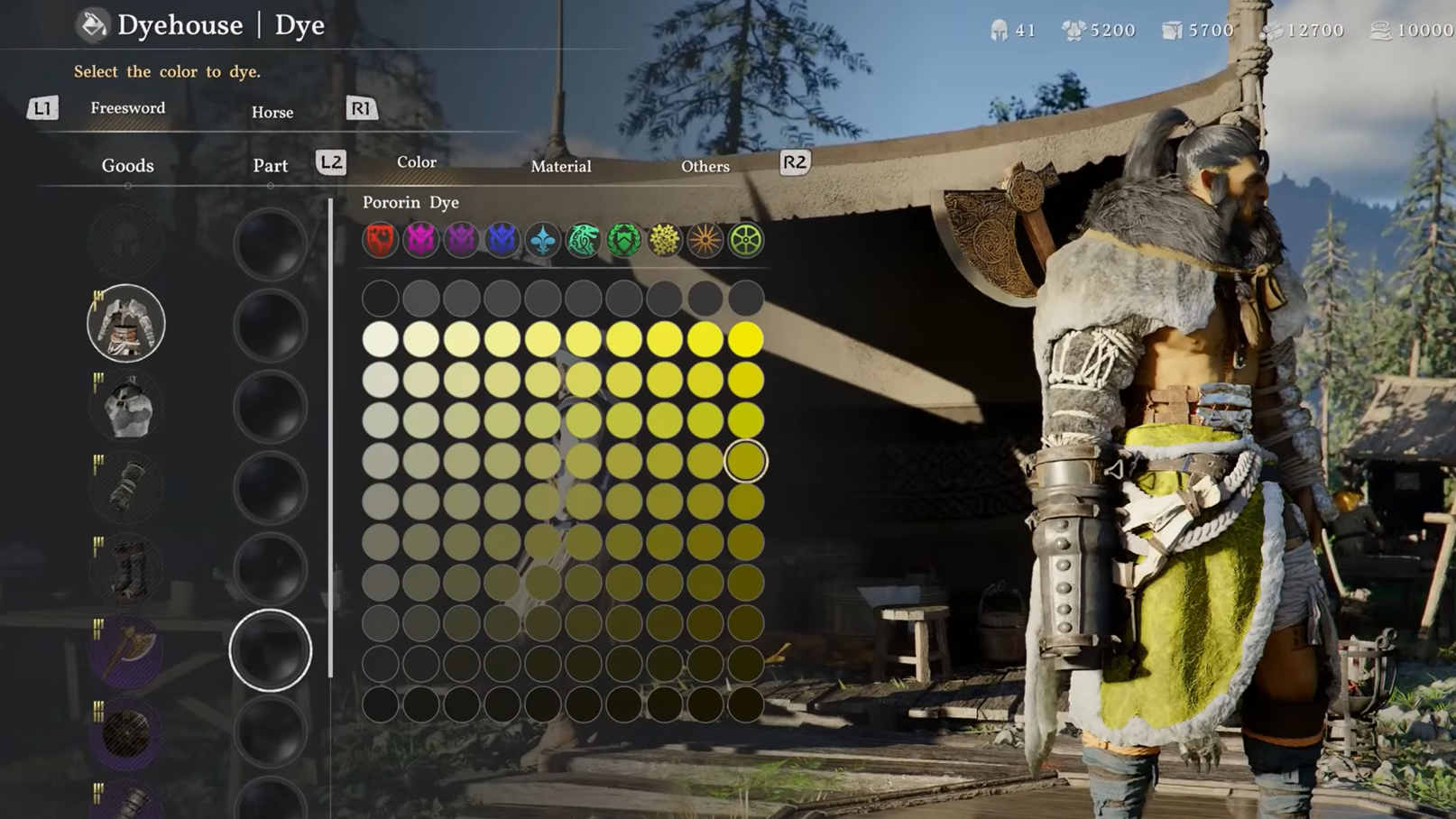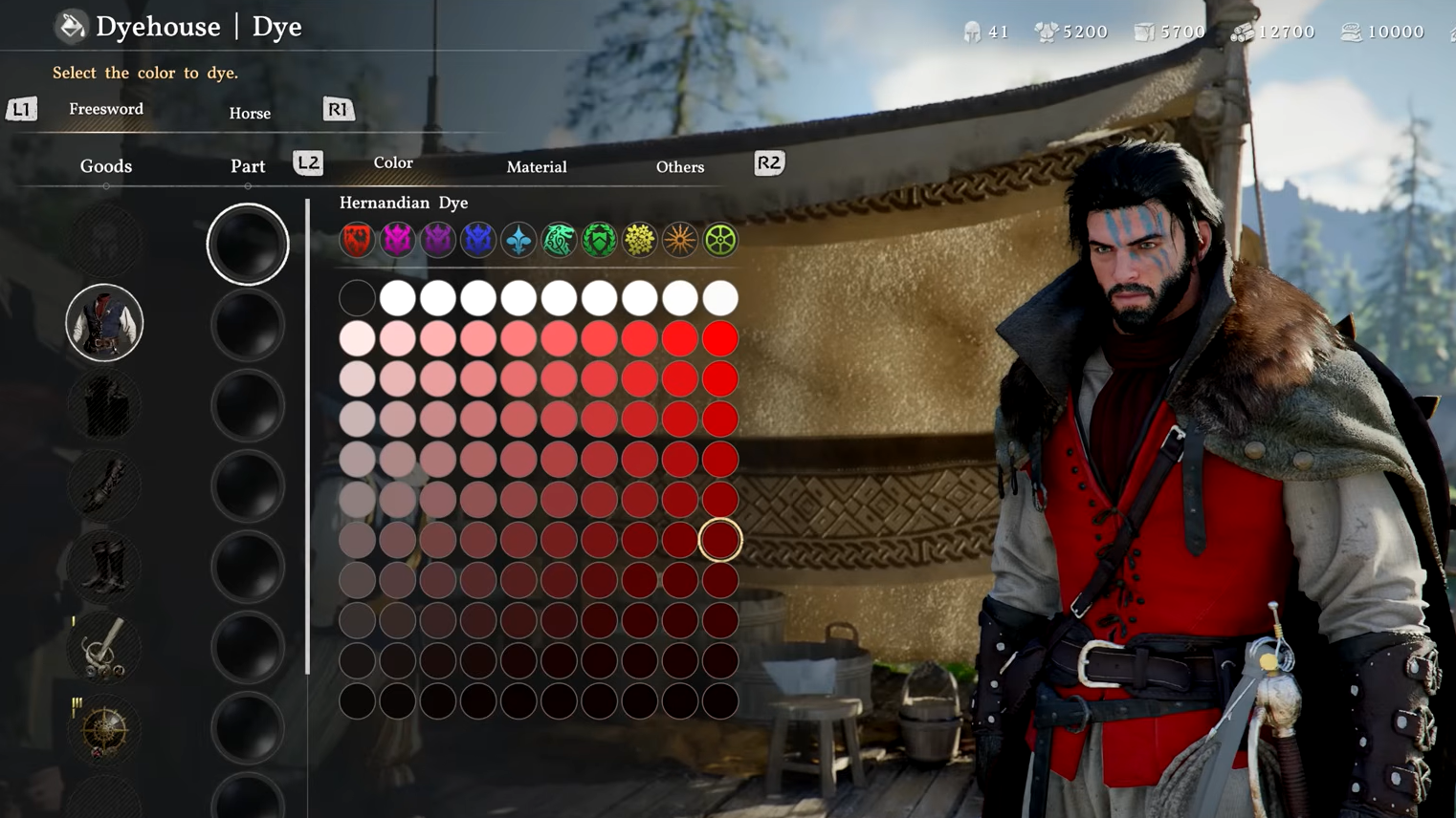 The Dyehouse handles everything the Barber Shop does not. Also located in the Greymane camp, it lets you change the color and material finish of your equipment with a level of granularity that goes well beyond a simple global tint. You can select individual armor pieces and then target individual sections within those pieces for separate color treatment. Want a black chest plate with gold trim paired with dark red gauntlets? That kind of precision is exactly what the system supports.