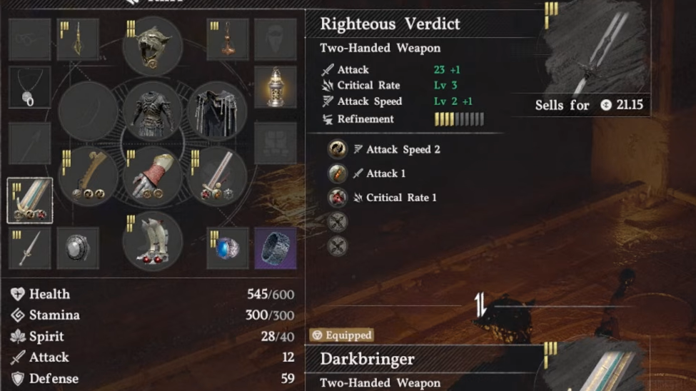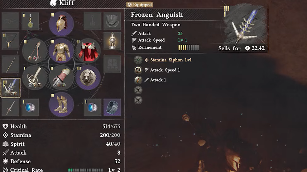 If you want a spear before reaching the Frostveiled Castle Ruins, the Spear of Righteousness can drop from Bleed Bandits in the Hernand area. The Karin Quarry is a reliable farming spot for this weapon. It's a decent early spear, though it lacks the embedded gears that make the Hwando so dominant at the same stage of the game.