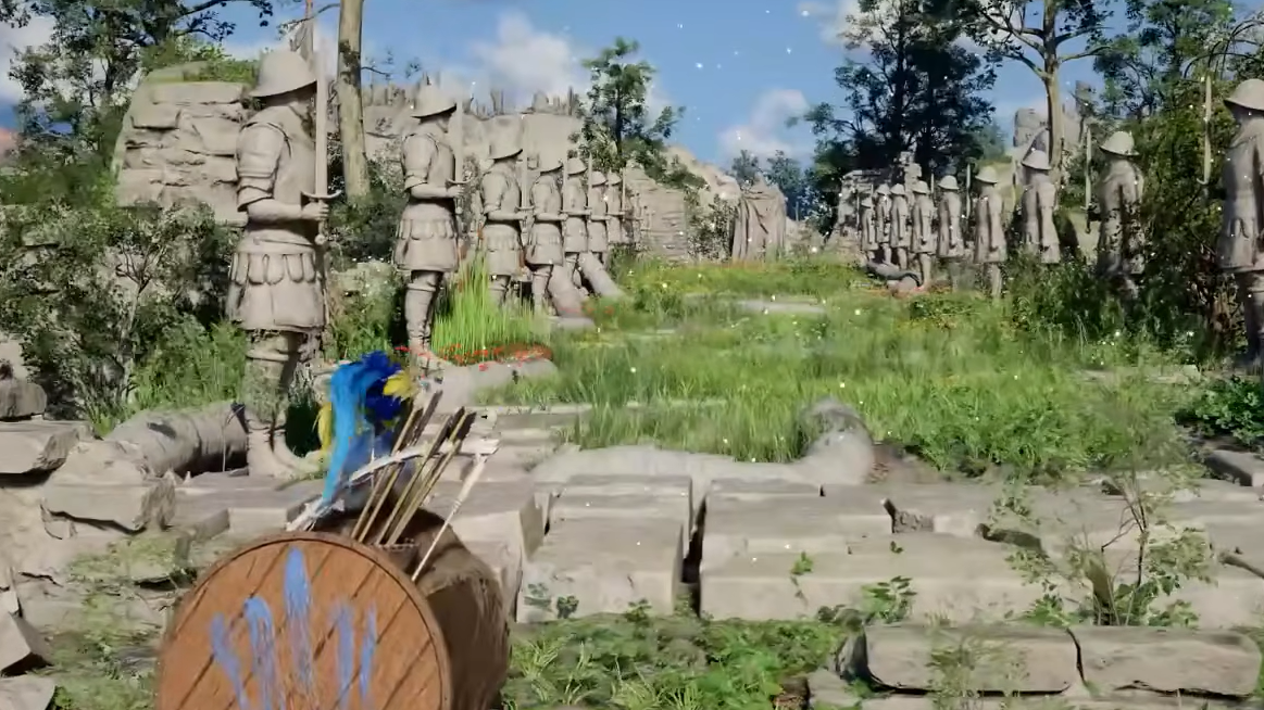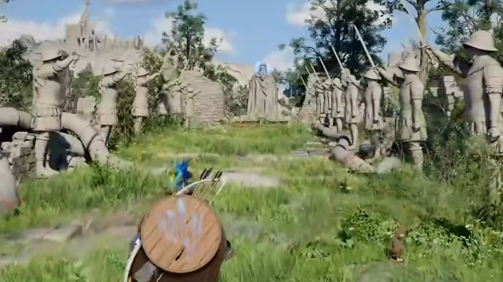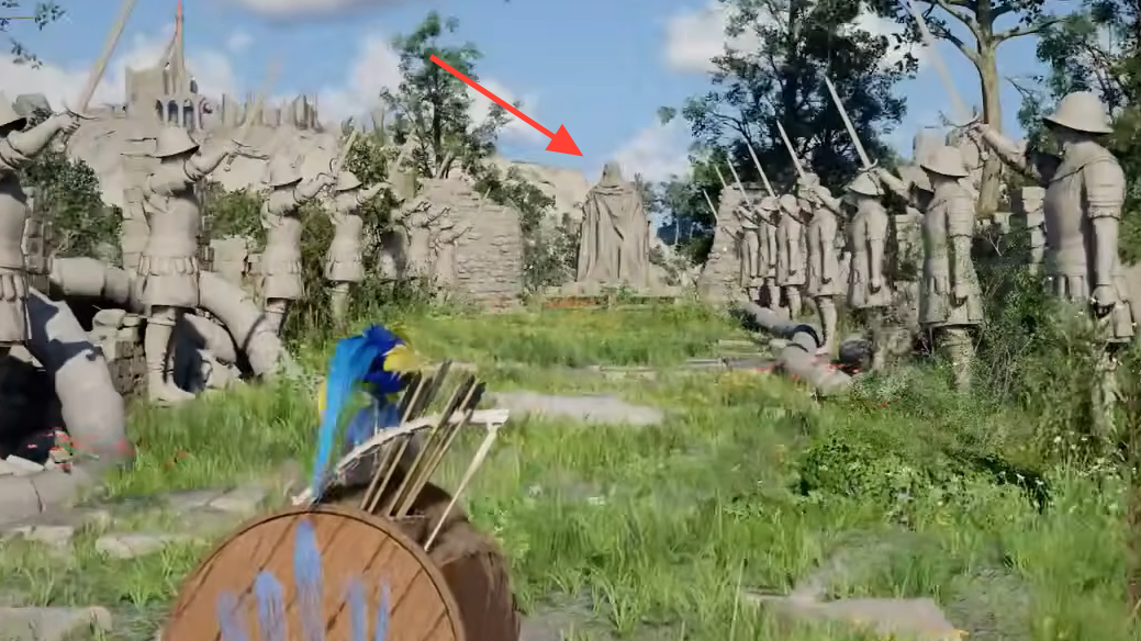 The Drakesfall Gorge puzzle borrows directly from the classic children's game. Two rows of Hernandian soldier statues line a pathway, and a large elder or "king" statue stands at the far end. When you step on the stone pressure plate at the start of the path, the soldier statues raise their swords, and the elder statue activates, periodically turning to face you.