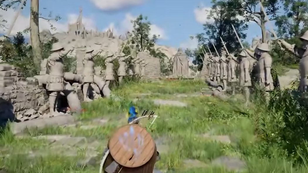 The Drakesfall Gorge puzzle borrows directly from the classic children's game. Two rows of Hernandian soldier statues line a pathway, and a large elder or "king" statue stands at the far end. When you step on the stone pressure plate at the start of the path, the soldier statues raise their swords, and the elder statue activates, periodically turning to face you.