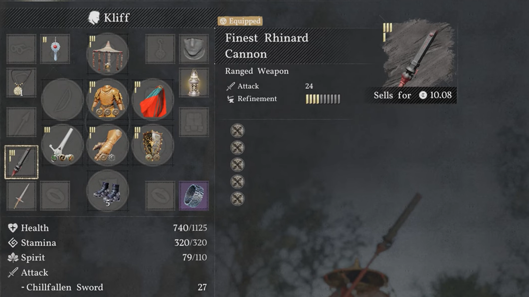 Kliff can equip the Finest Rhinard Cannon, making it one of the few firearm-style weapons available to him. You don't have to sacrifice your other loadout to use it either — equipping a sword and shield in your primary slot and then switching to the cannon mid-combat works without any conflict.
