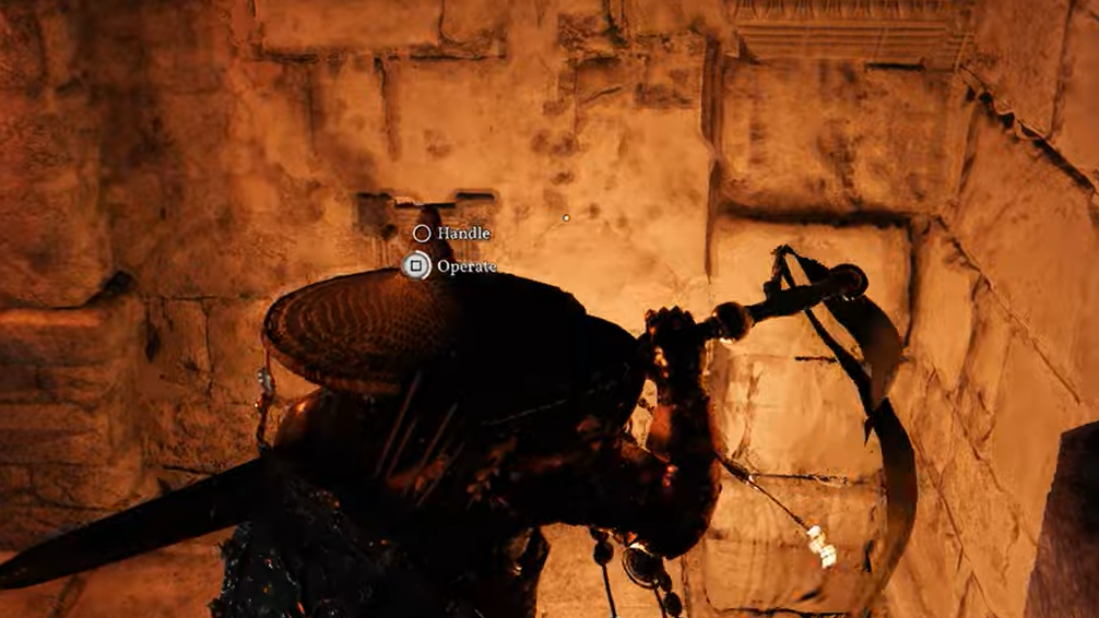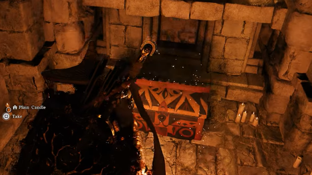 Step 1: Shortly after entering, you'll encounter a small door that won't open when you interact with it directly. Look for two wall-mounted torch sconces positioned on opposite walls near the door. Light both of them to trigger the door to open.