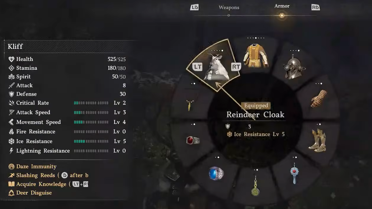 The cloak visually stands out — it's a full reindeer-head hood complete with antlers, making it one of the more distinctive pieces of gear in the early-to-mid game. Beyond aesthetics, that Level 5 Ice Resistance is genuinely useful for surviving the snowy mountain zones that open up around this point in the story. Some players have also noted that similar animal-themed headgear can function as a disguise around wildlife, though this hasn't been confirmed specifically for the Reindeer Cloak.