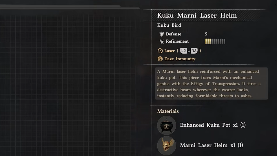 The base helm is fun, but the upgraded Kuku Marni Laser Helm is a substantial improvement. It can be refined for higher defense, and it fires three laser shots instead of one. Crafting it requires a blueprint, the original helm, and several materials gathered from different corners of the map.