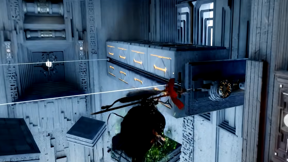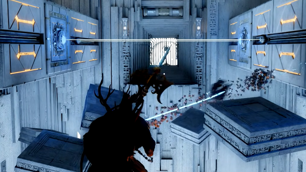 Step 12: Move north into the newly opened room. Be extremely careful here — the gap is easy to misjudge. Your safest approach is to use Axiom Force to reach one of the upper platforms (left or right), then drop down once you're close enough to the room's entrance.