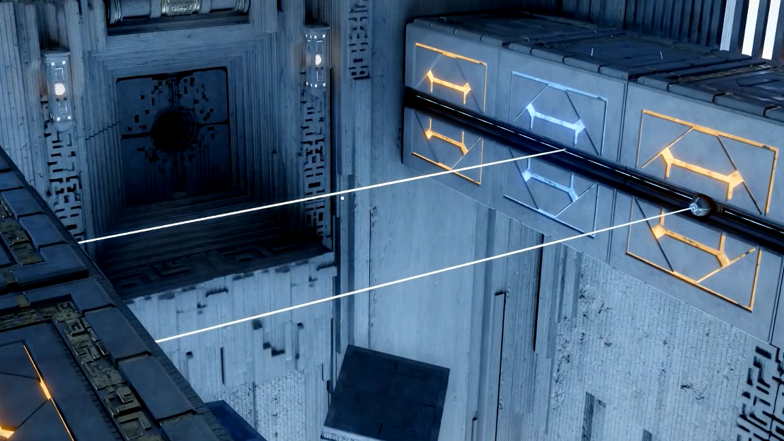 Step 2: A new section opens in the center of the room. Jump down into it. Use Axiom Force on the right button, then select the cube that has the yellow button on it. Rotate it to the right twice. A line will appear on the cube, and all four cubes on the right side should now be aligned.