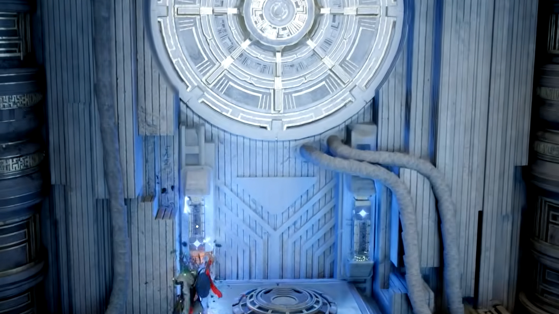 Step 13: Inside the final room, you'll see a large circular device with a blue pillar in front of it. Use Axiom Force on the blue pillar and insert it into the left slot below the device. Then use Force Current or Force Palm to attach it securely. Finally, interact with the device itself to activate the teleporter beneath it. Step onto the teleporter to collect your Abyss Artifact.