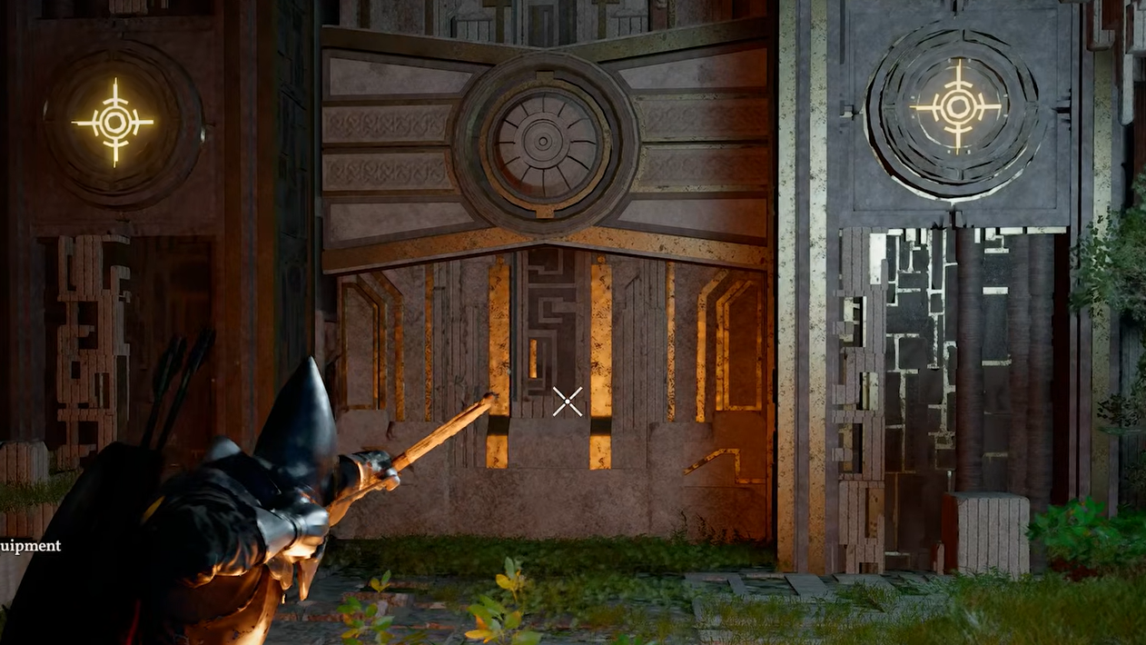 Step 2: Walk up to the vault door. Two yellow crosshair buttons sit on either side of it. Shoot one with an arrow, and a blue light ring will appear around it — you need to hit the second button before that ring fades completely. Focus Shot is the easiest way to handle this, since you can tag both targets and fire them off nearly simultaneously. After both activate, the lock disappears. Use Nature's Grasp to lift the door and step inside.