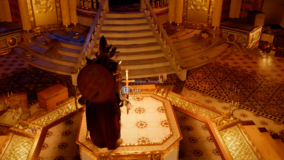 Step 4: Walk to the pedestal and pick up the Golden Sword, a unique weapon. Grabbing it causes the central platform to descend into the lower levels of the vault. Before you drop down, loot any chests and items scattered around the room — there's no easy way back up once you go.