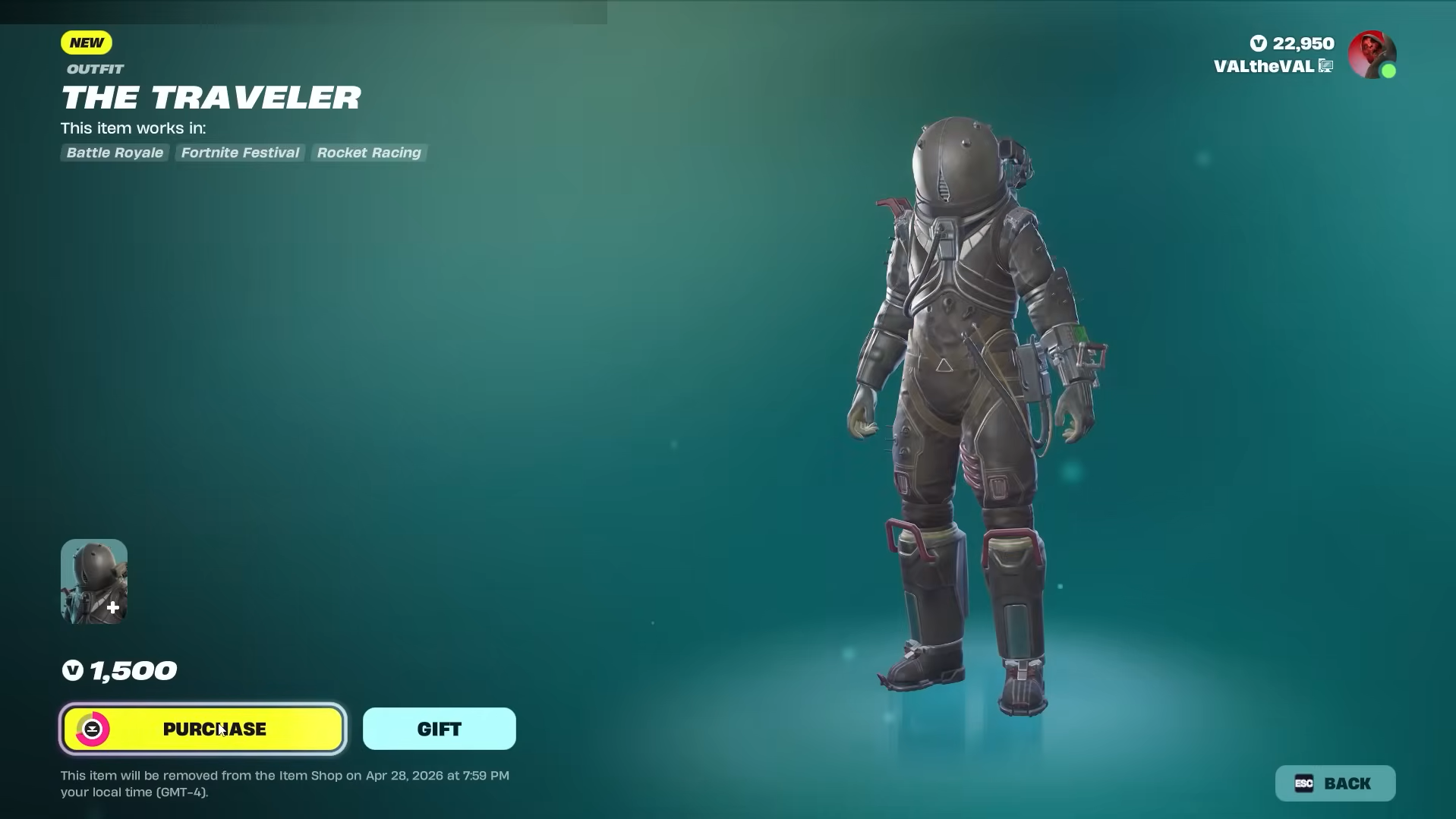 | Fortnite Item Shop | 1,500 V-Bucks (~$15.99) | Traveler Outfit only |