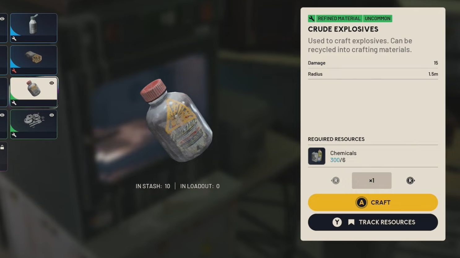 Several higher-tier materials and explosives break down into Crude Explosives when recycled. This is useful when you have surplus gear that no longer fits your build or when you are pushing a workshop upgrade and need raw explosives more than finished grenades.