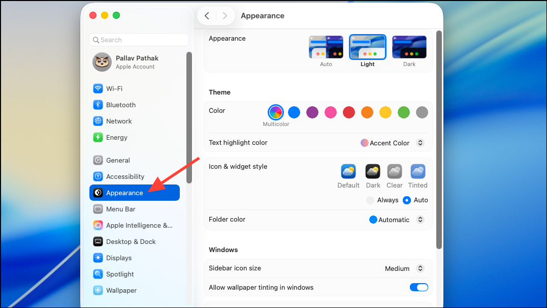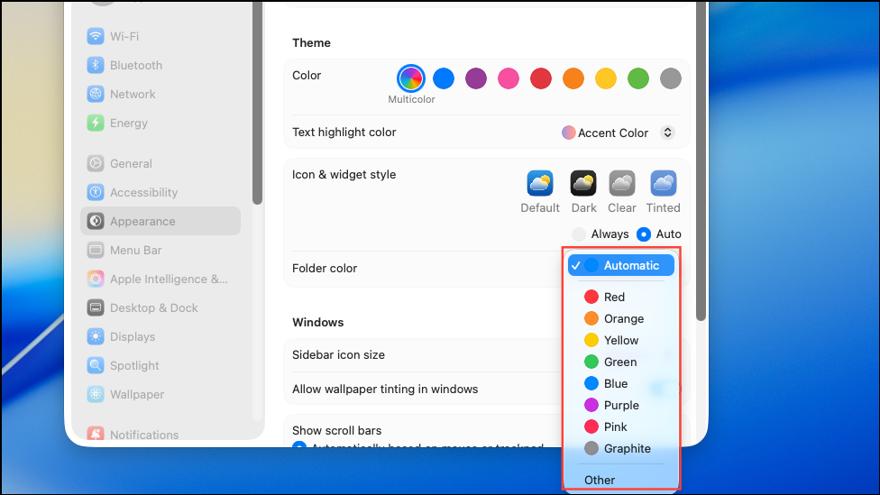 macOS 26 Tahoe introduces broader theming options through System Settings > Appearance. Users can now adjust folder colors globally, applying a single color to all folders for a unified look or to differentiate drives and user environments.