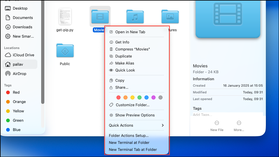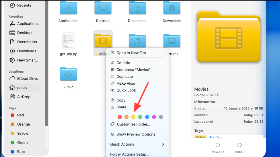 Step 2: At the bottom of the menu, you'll see a row of colored circles. Click any color to instantly apply it to the folder. The folder icon updates in real time, making it stand out in any Finder view.
