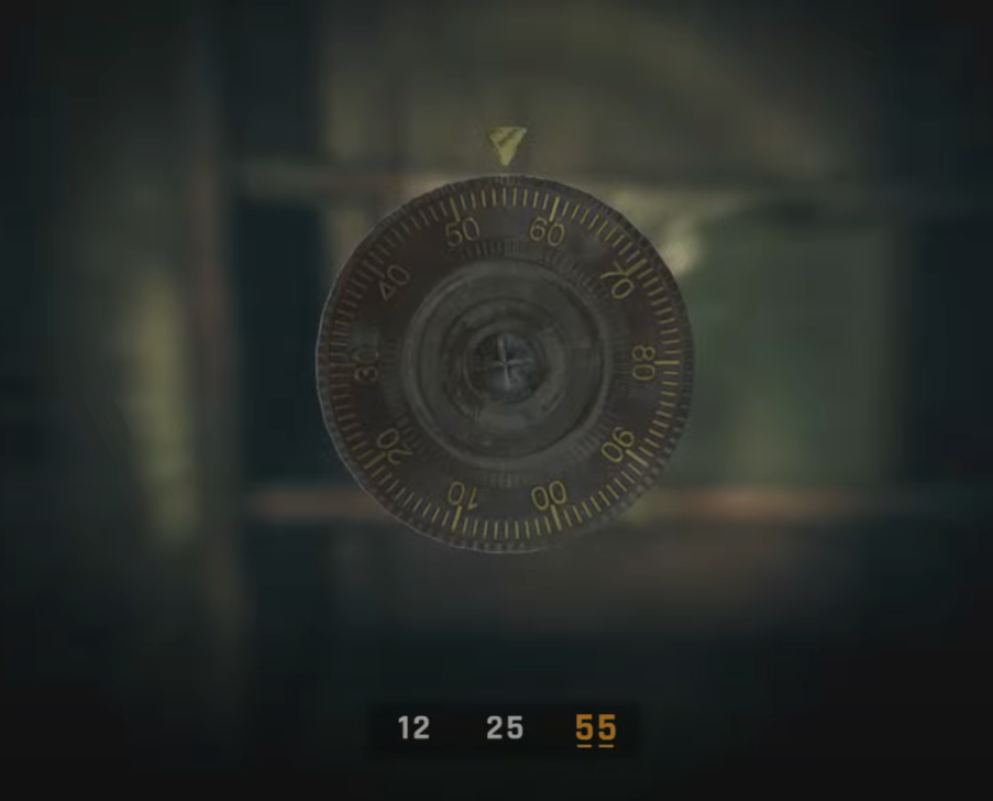 - Interact with the safe and dial the code left to right: 12, 25, 55.