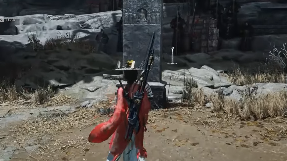 Step 2: Inspect the large tombstone-like structure at the edge of the arena. If it is hard to see interaction prompts, use Wind Sense. Interacting with the stone adds The Name of Chunqui fragment.
