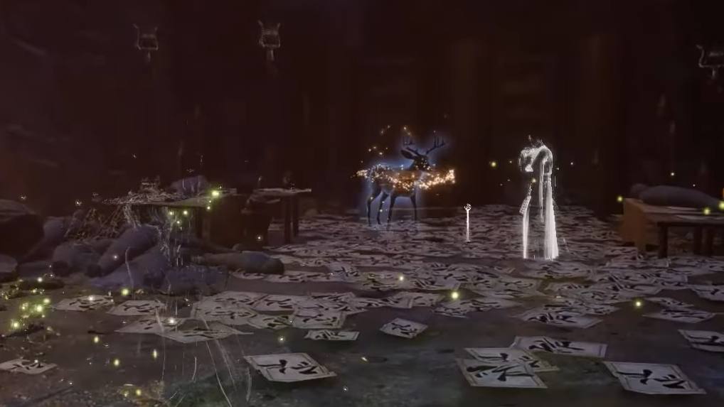 Step 2: Navigate upwards again through roots and platforms until you locate a deer spirit and the spirit of Liu Qingyi standing nearby on one of the upper floors.
