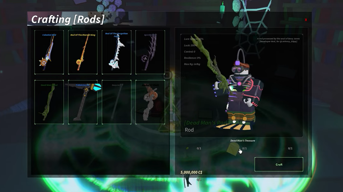 Dead Man’s Rod sits at the top end of Fisch’s fishing tools, building on the same story thread that runs through Dead Man Joe, Oscar’s Locker, and the Great Rod of Oscar. It is not a quest reward you stumble into early; it is a late-game, craft-only rod aimed at players already deep into the game’s progression.