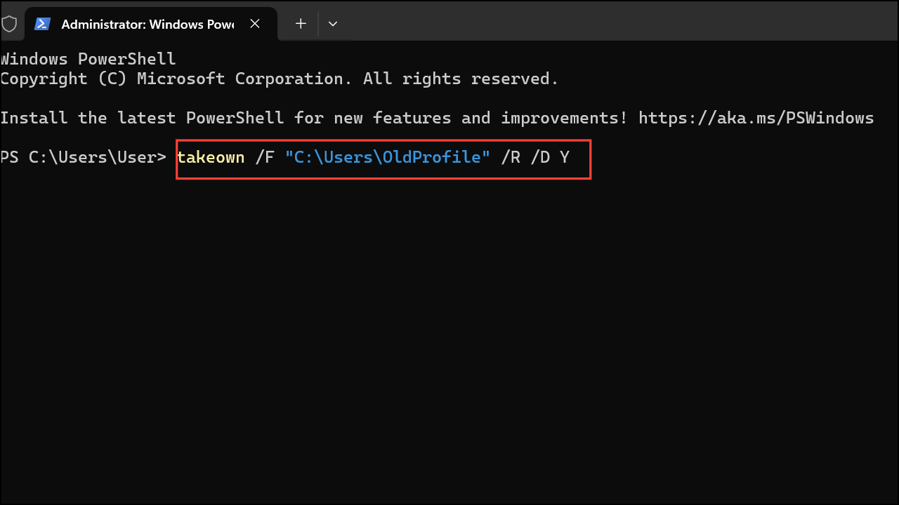takeown /F "C:\Users\OldProfile" /R /D Y