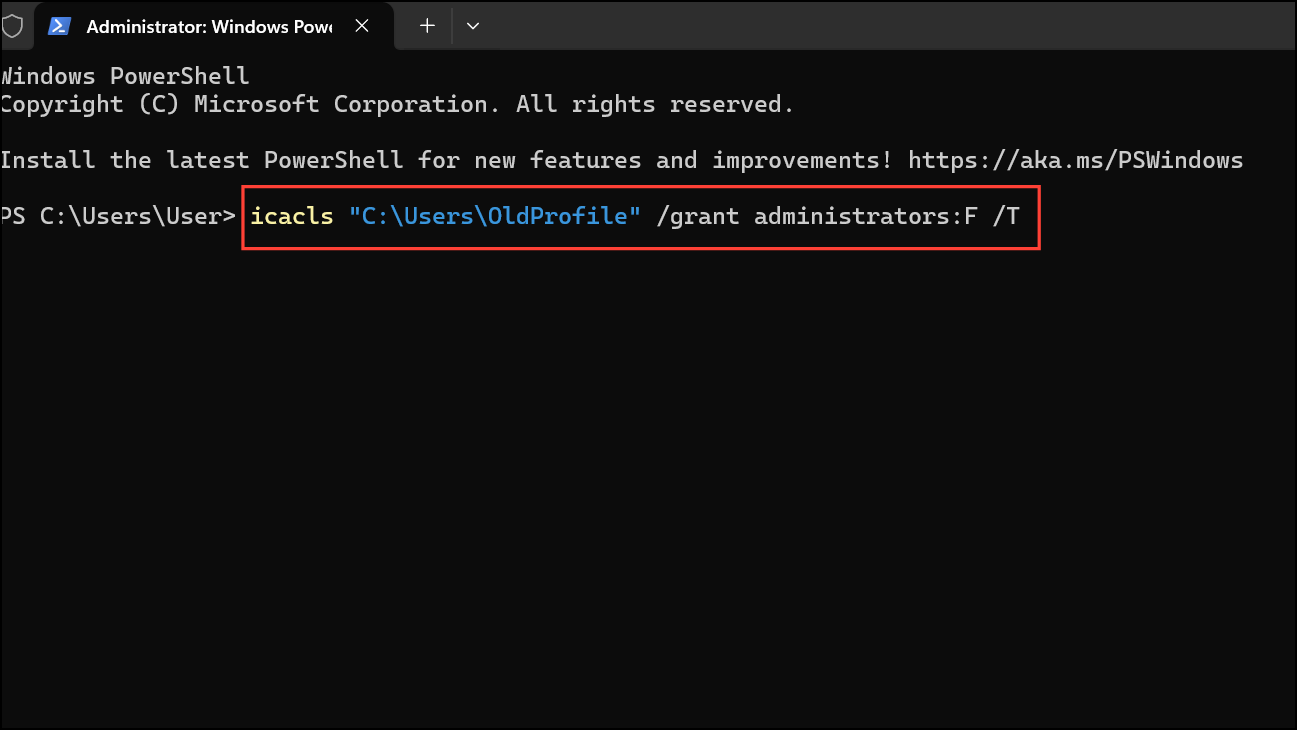 icacls "C:\Users\OldProfile" /grant administrators:F /T
