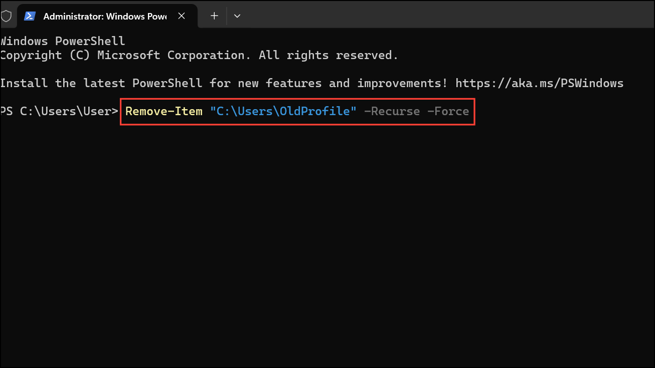 Step 2: Use the Remove-Item command to delete the folder. To ensure all contents are removed, include the -Recurse and -Force parameters. For example, to delete a folder named OldProfile: