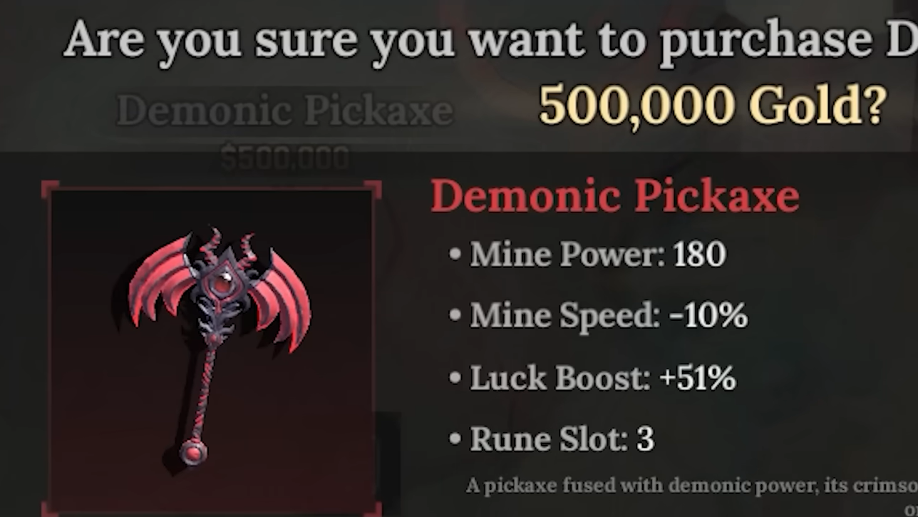 The Demonic Pickaxe trades a small hit to Mine Speed for a large jump in Mine Power and a best-in-slot Luck Boost. With three Rune Slots, it can stack mining runes to offset the speed penalty and push its already high power even further.
